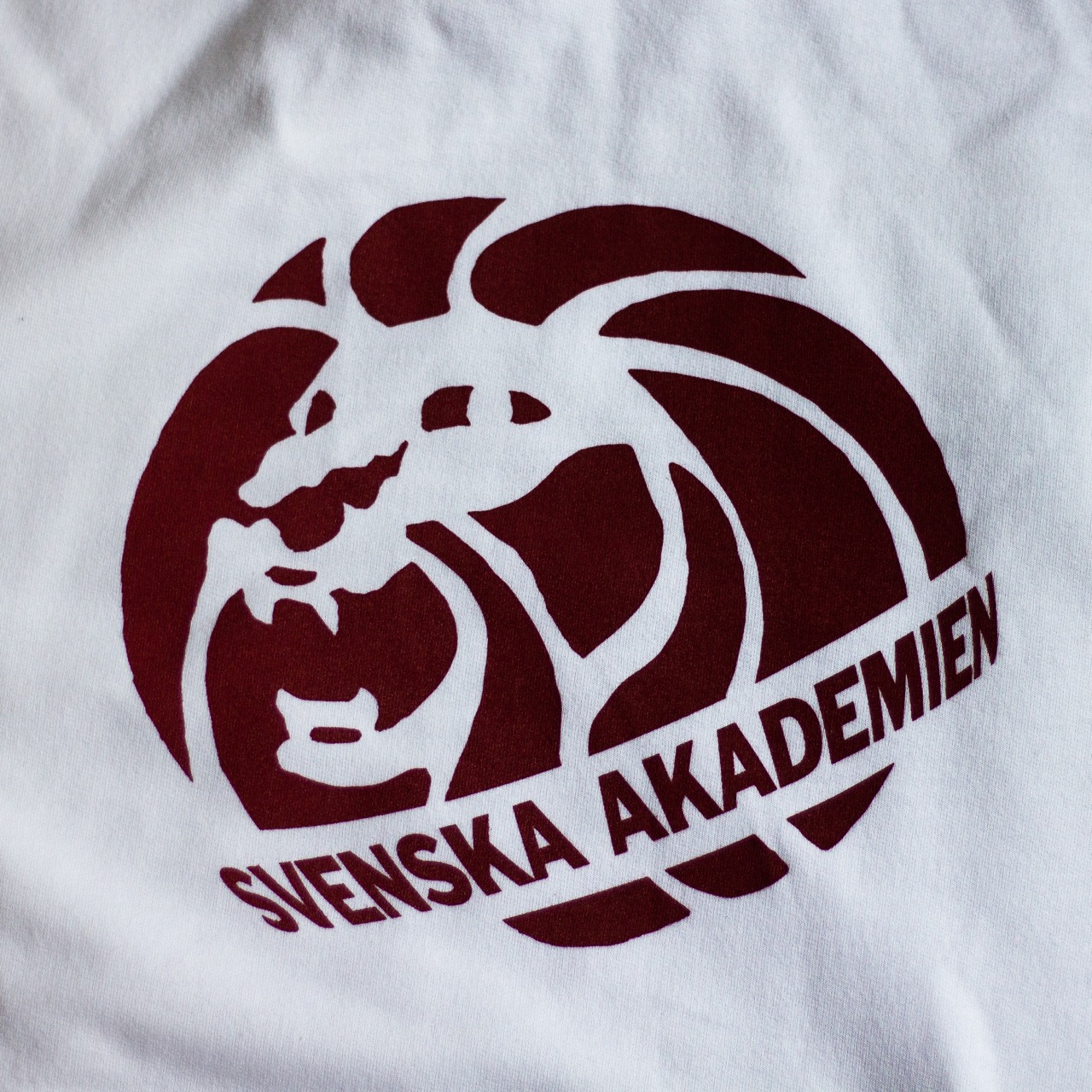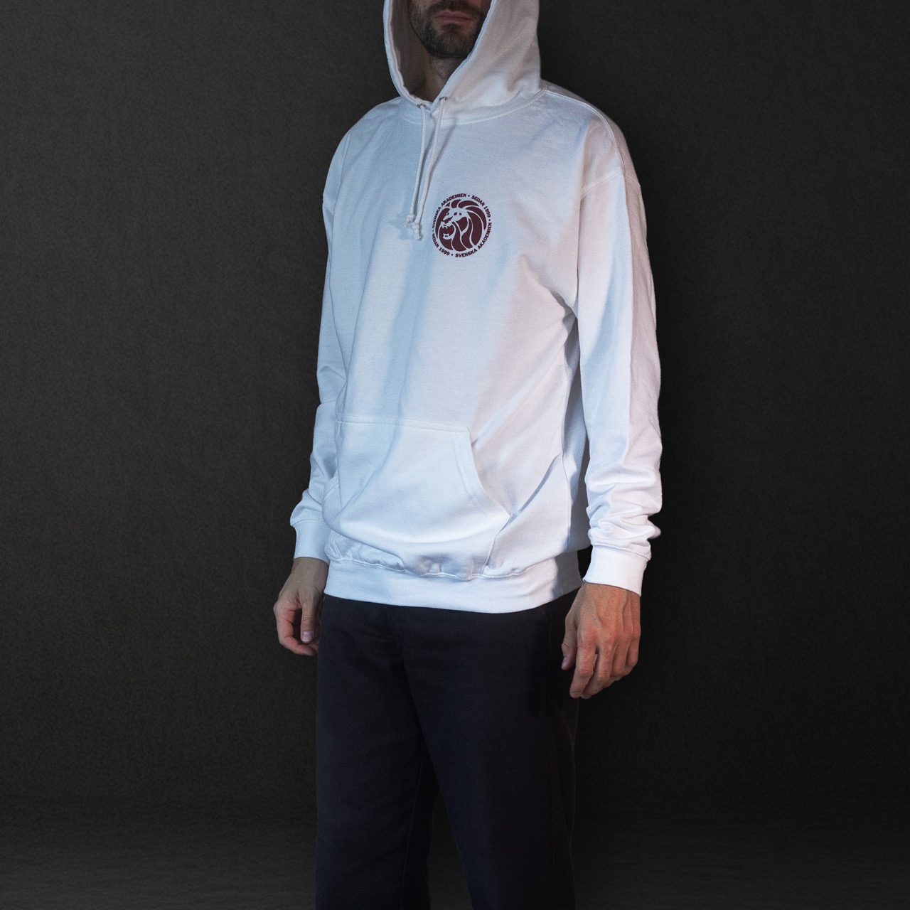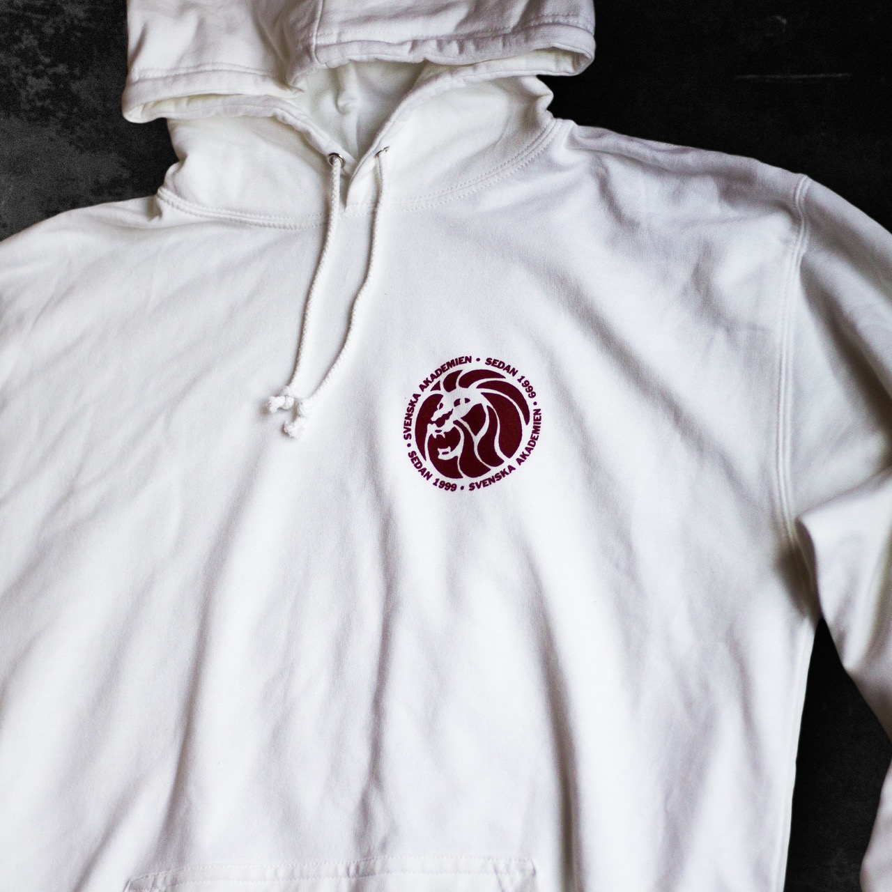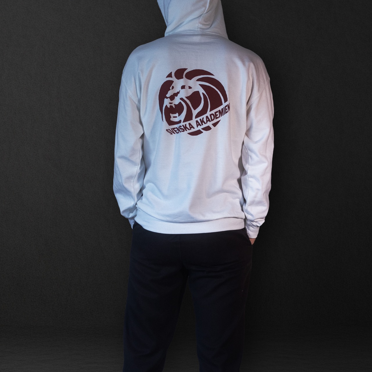 Vit hoodie med mörkröd liten logga på bröstet och stor logga på ryggen.