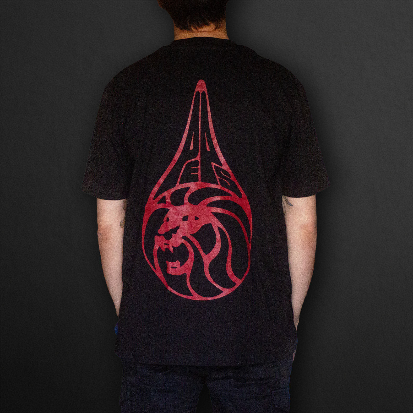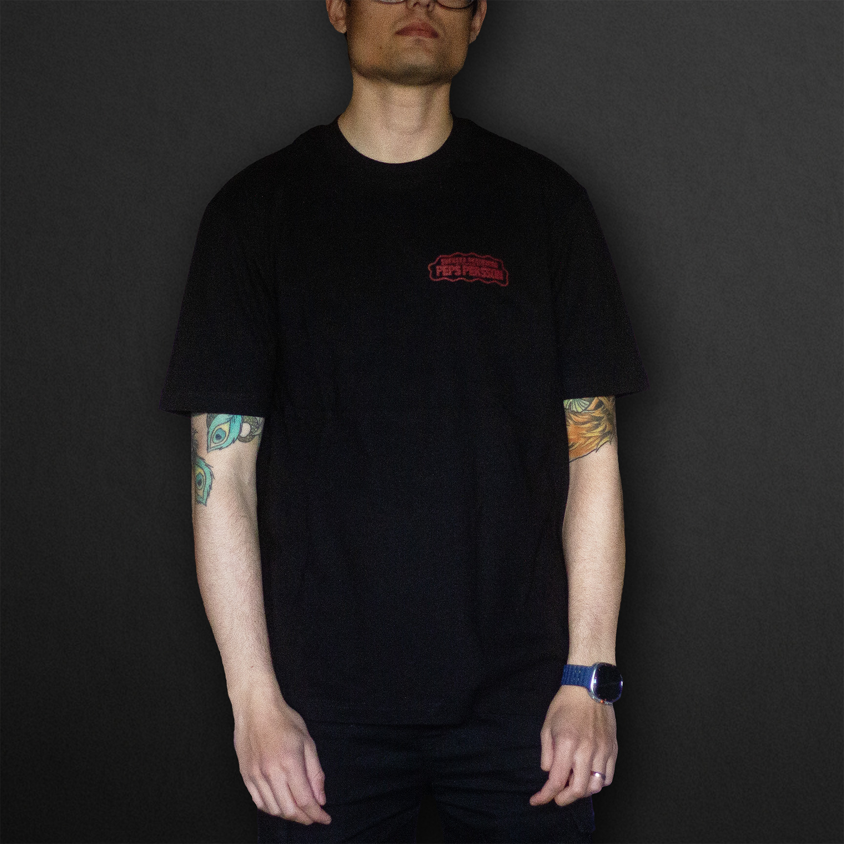 Svart t-shirt med röd text på bröstet ”Svenska Akademien hyllar Peps Persson”.
