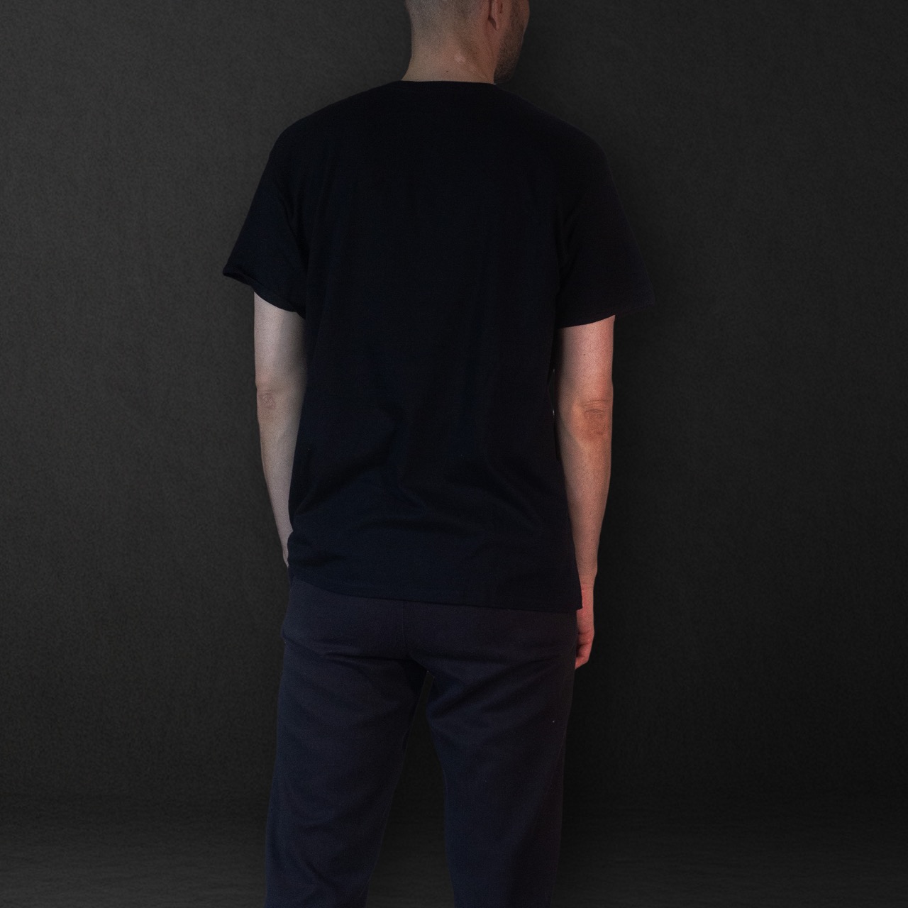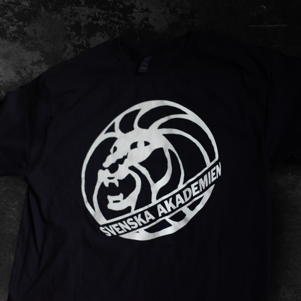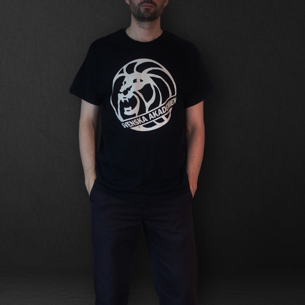 Svart t-shirt med gråaktig stor logga på bröstet.