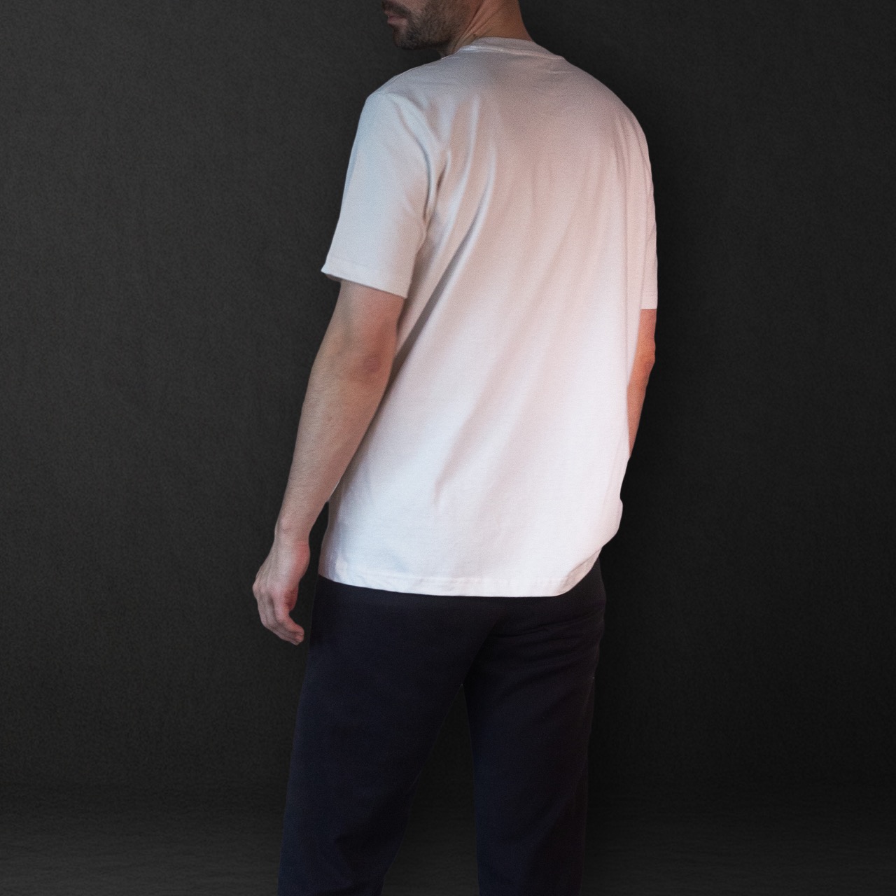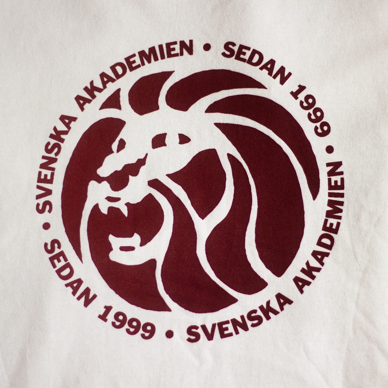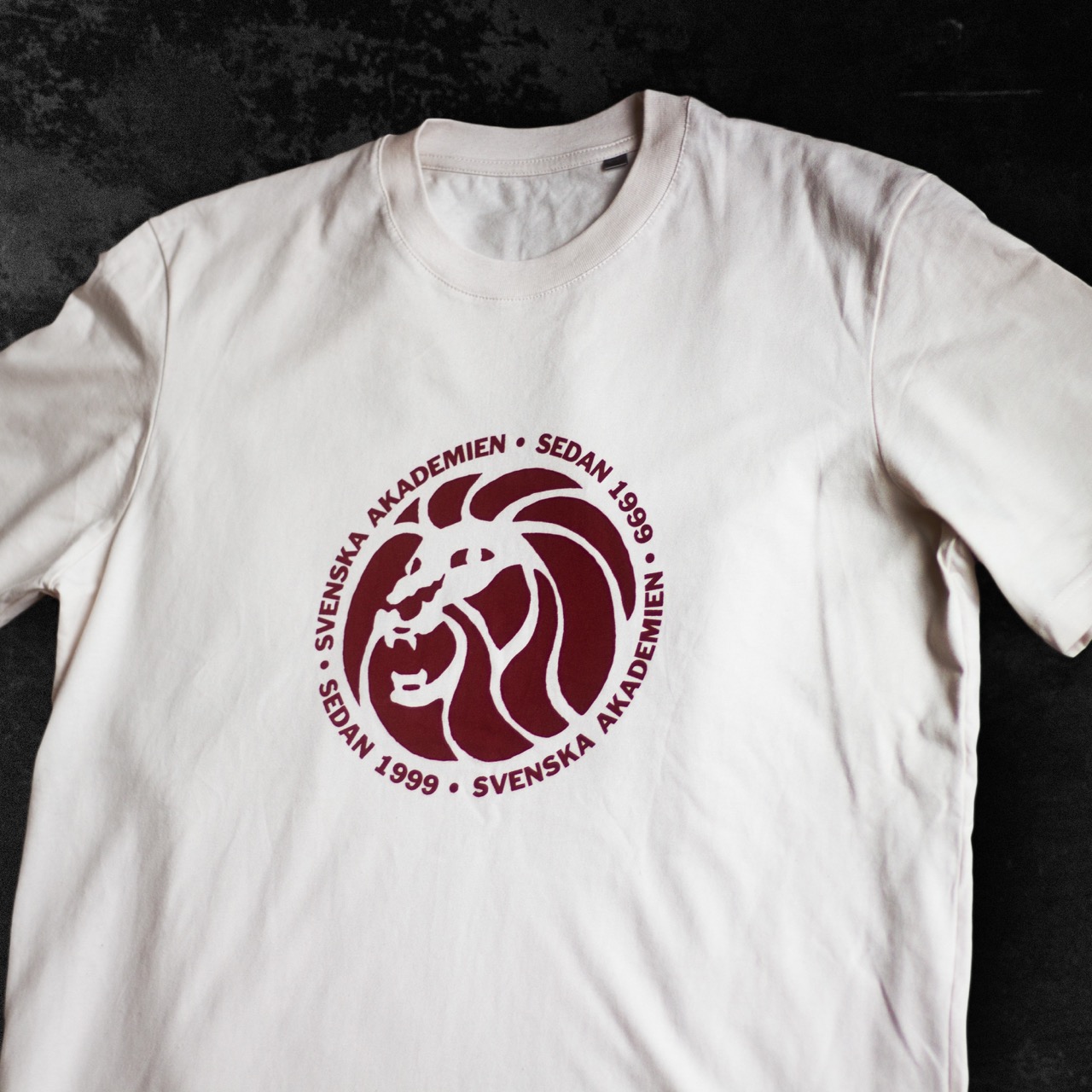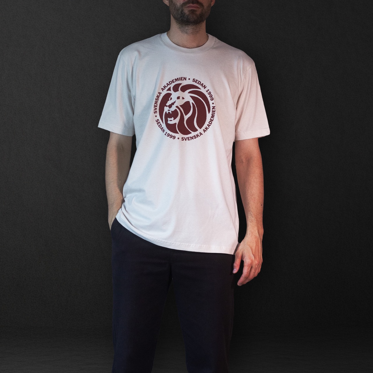 Off-white tshirt med stor mörkröd logga på bröstet.